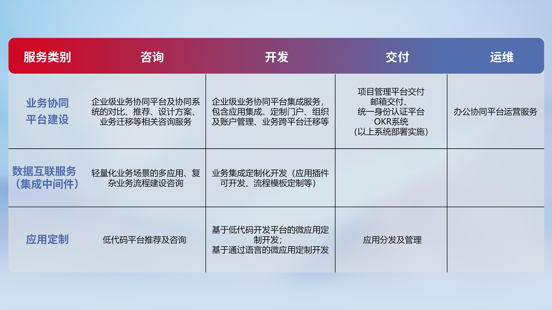 针对钉钉、、、、企微、、IDaas等平台级产品提供产品的规划、、、、方案、、、交付、、、、定制化开发等服务,,实现如统一协同办公、、、智能客户服务、、、混合会议管理、、智能数据查询、、等业务场景,,实现数字化转型。。。